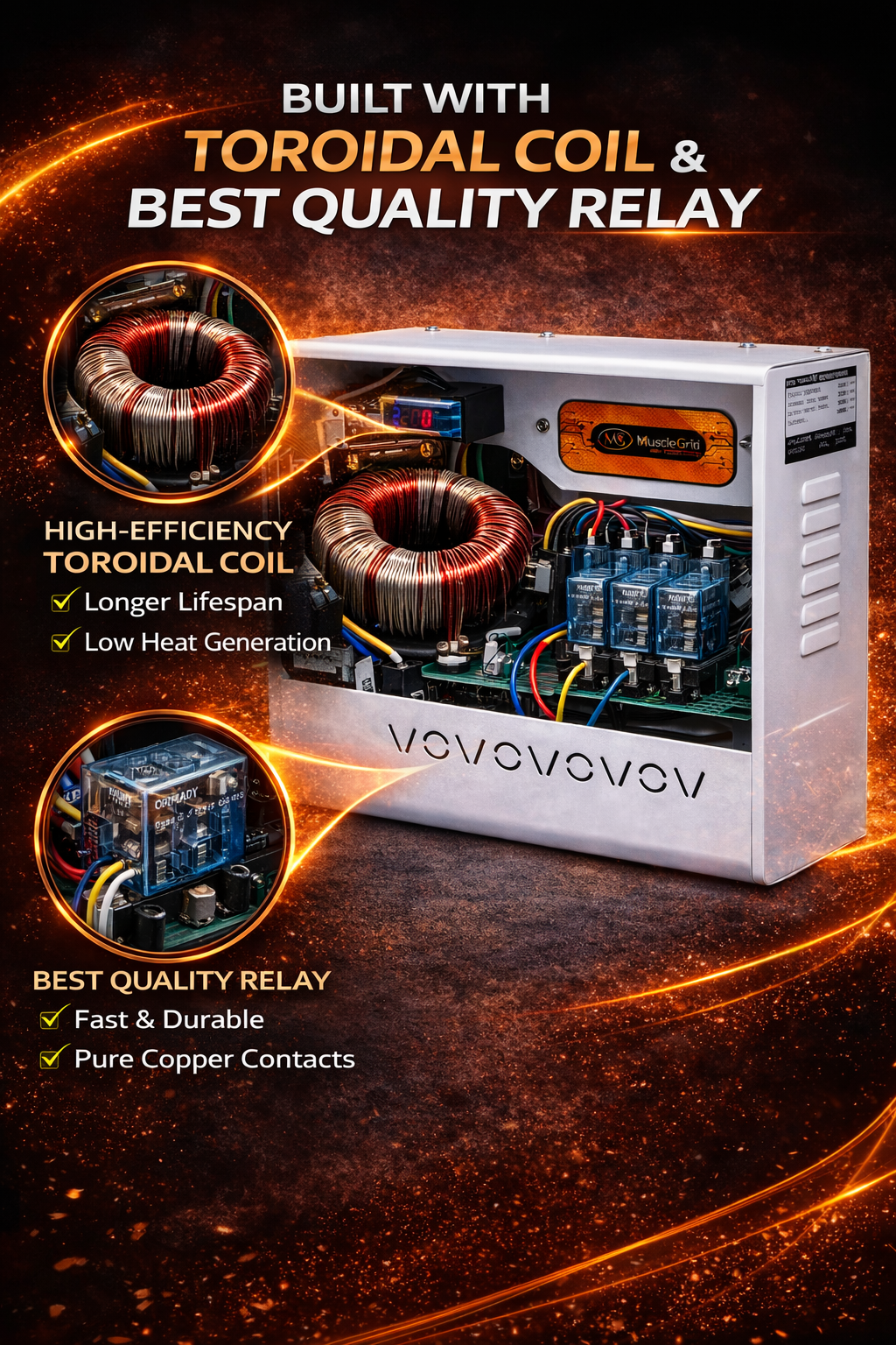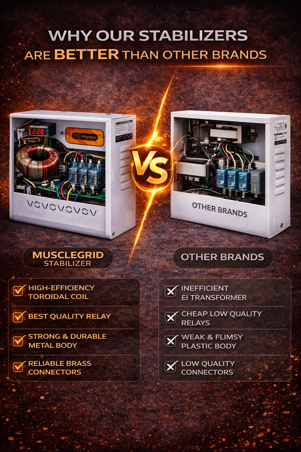 Protect your air conditioner from voltage fluctuations with MuscleGrid’s heavy-duty 4kVA stabilizer designed for Indian power conditions.