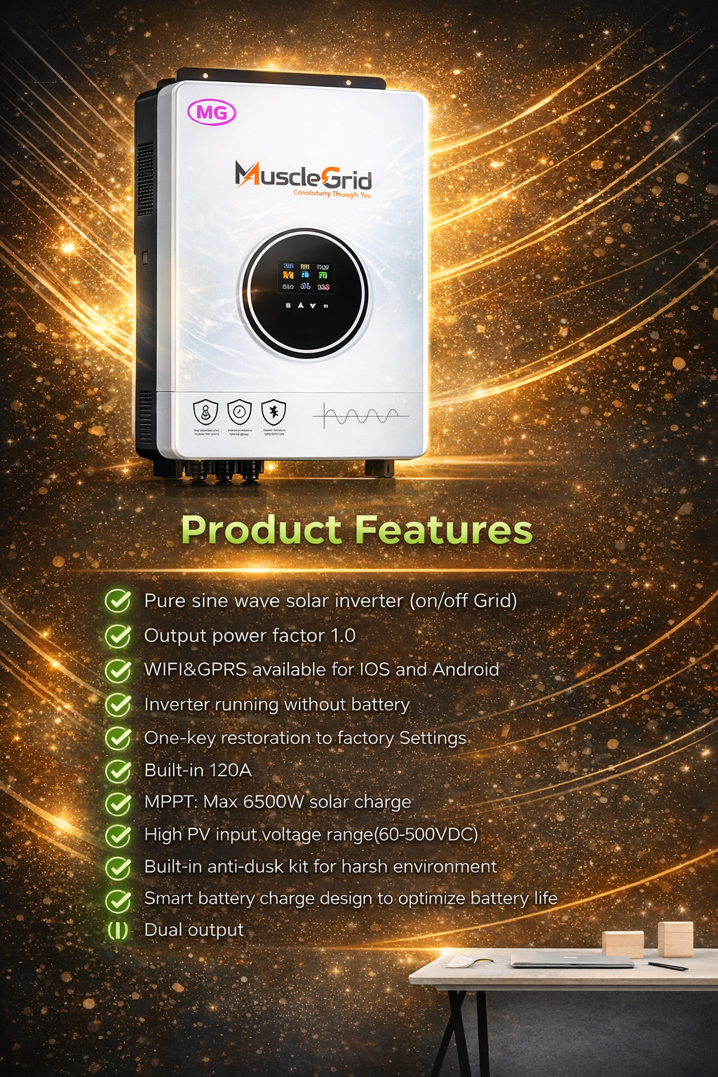 The MuscleGrid 6.2kW True Hybrid Solar Inverter is designed for Indian residential homes that require reliable solar power with efficient grid support. Equipped with MPPT technology, it optimizes solar energy utilization to deliver stable and efficient performance throughout the day.